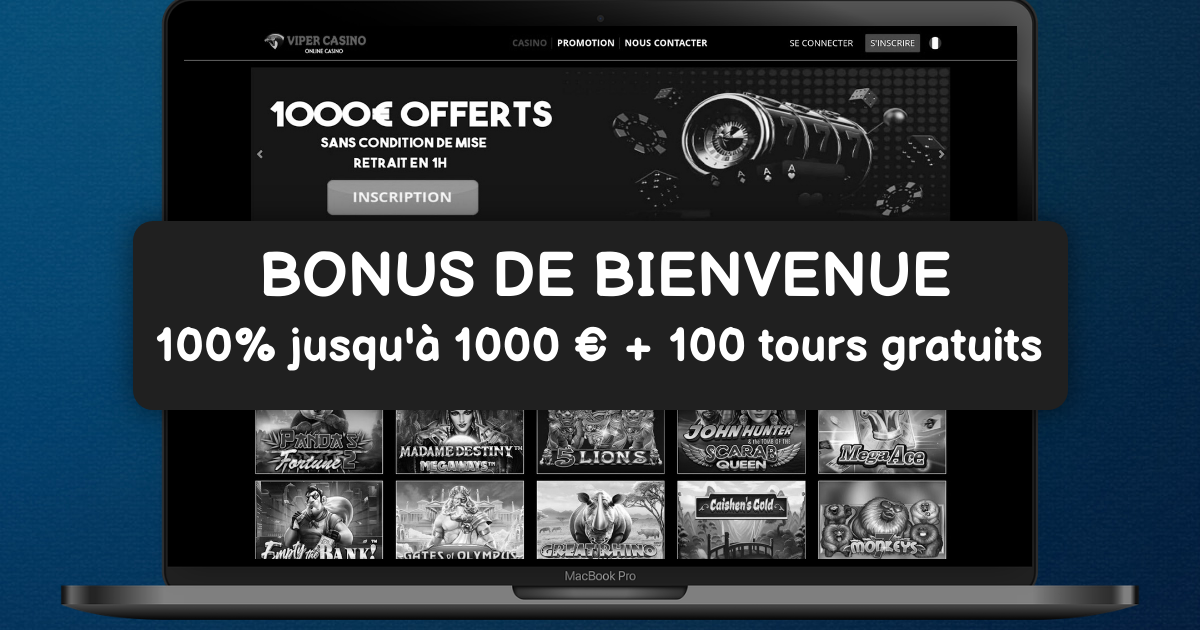 Le bonus de bienvenue de Viper Casino figure parmi les offres les plus attractives du marché français. Les nouveaux joueurs peuvent bénéficier d'un bonus pouvant atteindre jusqu'à 500 €, avec des pourcentages qui varient selon les périodes promotionnelles. Les offres alternent généralement entre 100% et 160% du montant du premier dépôt.
